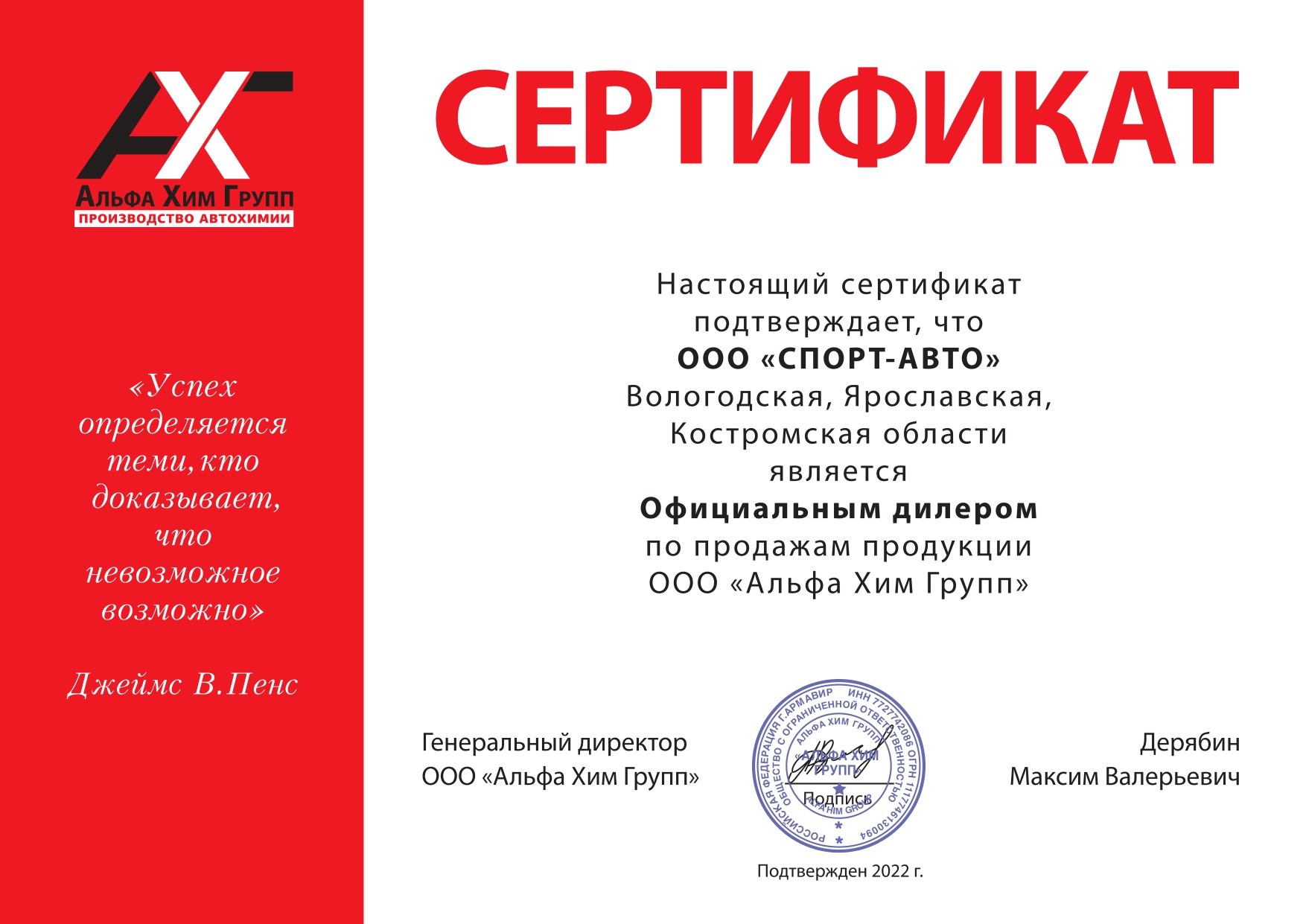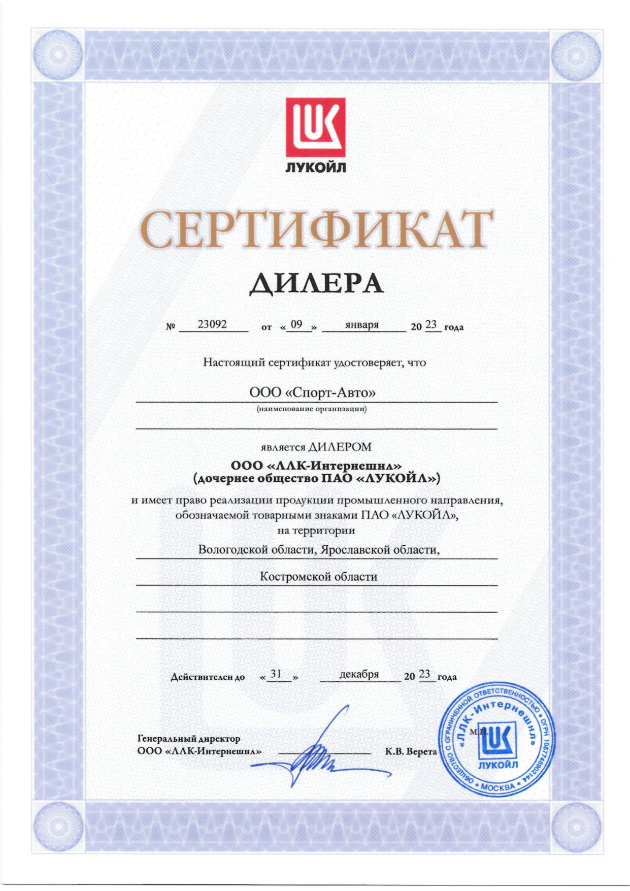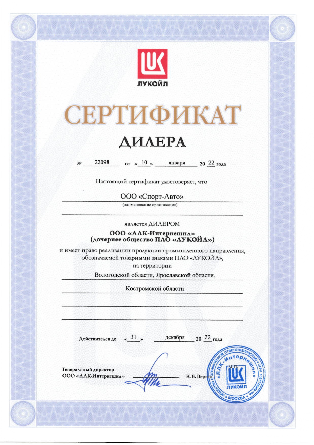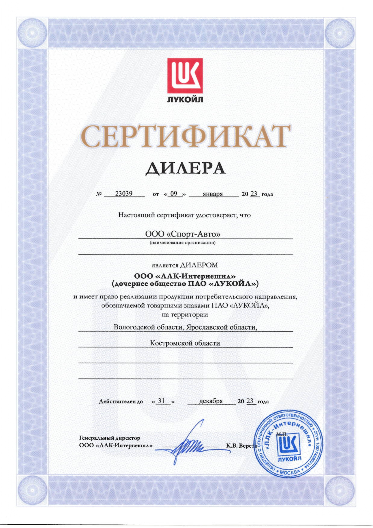 Компания "Спорт-Авто" с 2003 года является официальным дилером компании ООО "ЛЛК-Интернешнл" по фасованным маслам. За это время проведена большая работа по продвижению бренда масел ЛУКОЙЛ на территории Вологодской области. В 2016 году компания "Спорт-Авто" получила статус официального дилера по Ярославской и Костромской областям.